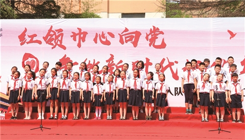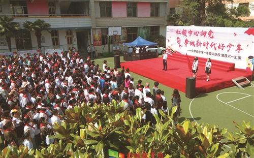 隨著嘹亮的《出旗曲》,大隊旗手手持大隊旗走向主席臺,同學們行注目禮,在鮮艷的旗幟下一起共唱《少年先鋒隊隊歌》。