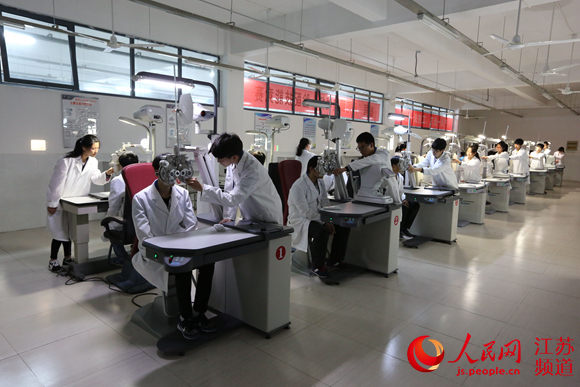 在江蘇省丹陽中等專業(yè)學(xué)校的眼視光與配鏡實訓(xùn)基地,學(xué)生們正在進行驗光操作。 耿志超 攝
