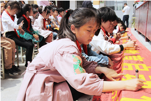 當(dāng)宣講人員講到新時(shí)代中國(guó)取得的偉大成就,特別是最近五年來祖國(guó)的高速發(fā)展時(shí),大家深切感受到祖國(guó)的強(qiáng)大,都非常自豪和驕傲,引發(fā)了集體強(qiáng)烈共鳴,同學(xué)們和宣講團(tuán)成員互動(dòng)起來,反響熱烈,引燃了現(xiàn)場(chǎng)所有人的愛國(guó)熱情,大家紛紛豎起大拇指為祖國(guó)點(diǎn)贊,并同聲高呼:厲害了,我的國(guó)!每一場(chǎng)報(bào)告會(huì)后同學(xué)們都爭(zhēng)先在“傳承紅色基因,爭(zhēng)做新時(shí)代好少年”條幅上認(rèn)真簽下自己的名字。