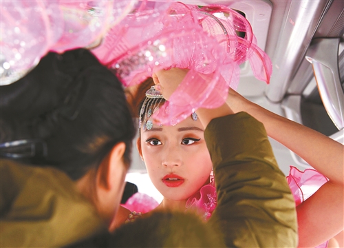 演員互相幫助佩戴頭飾,為演出精心裝扮。