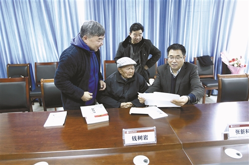 張新科教授向淮海戰(zhàn)役親歷者錢樹巖老人介紹小說《鏖戰(zhàn)》的創(chuàng)作歷程。