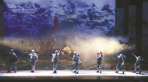 “這部戲題材的史詩性超過了我們過去任何一部,劇里邀請了馬可藝術(shù)團(tuán)加盟合唱,應(yīng)用了大量合唱、哼腔烘托氣氛;樂隊(duì)方面加入了許多西洋樂,音樂蒼勁有力,富有革命號召力。”