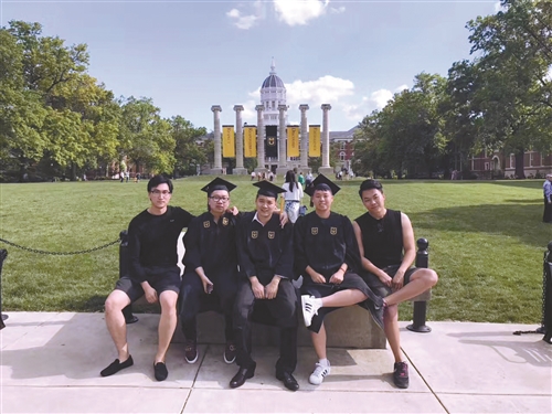 密蘇里大學(xué)校標(biāo)建筑前畢業(yè)合影。