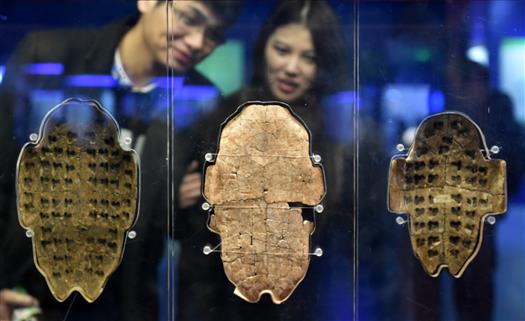市民在位于河南省安陽市的殷墟博物館中參觀刻有甲骨文的卜甲。新華社發(fā) 資料圖