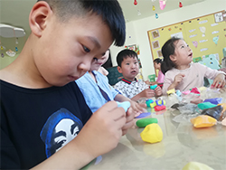 為了讓孩子體驗包粽子的感受以及發(fā)散孩子的創(chuàng)造思維能力,志愿者拿來超輕粘土,為孩子們準備了一場創(chuàng)意手工秀。首先由志愿者為孩子講解粽子的外形特征,示范粽子的制作手法,接著就輪到孩子們大展身手了。