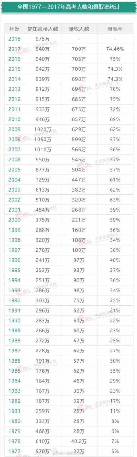 1977年和1978年,高考人數(shù)分別是570萬和610萬,這兩個(gè)數(shù)據(jù),相比于后邊很多年,是比較高的。原因大家都明白,文革10年耽誤了很多人考大學(xué)的機(jī)會(huì),所以,這兩個(gè)數(shù)據(jù)集中體現(xiàn)出積累釋放的特點(diǎn)。
