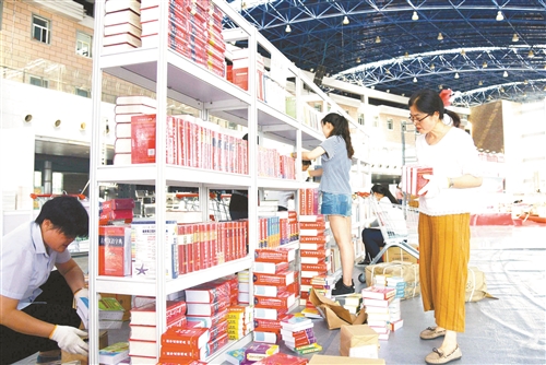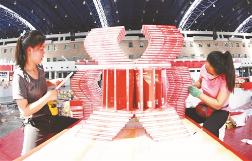距本周六第二屆淮海書展暨第九屆江蘇書展徐州分展場的開幕越來越近,6月27日,徐州國際會展中心1萬多平方米的大廳一派繁忙景象,展廳內(nèi)部的門頭裝飾施工正在有條不紊地進行,直對著展廳1號門的新時代主題館,幾位工作人員小心翼翼地摞著一本本書,搭設(shè)高聳別致的圖書堆場。