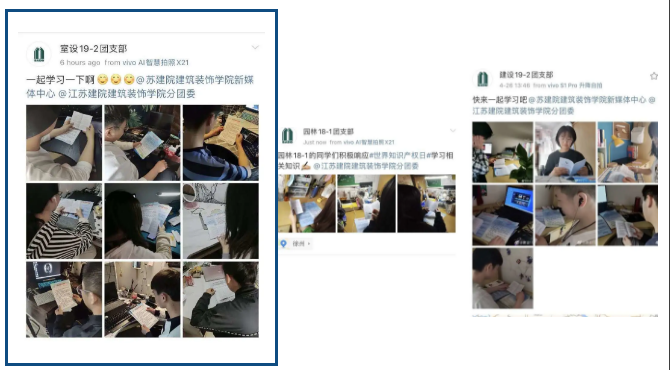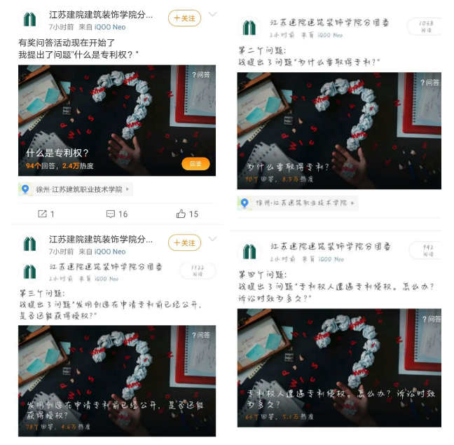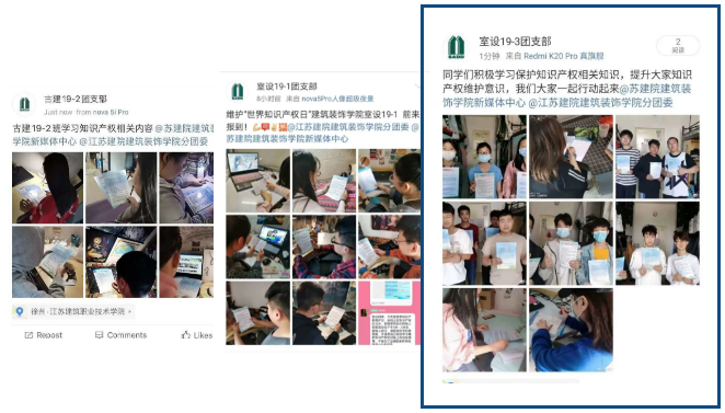 整個活動在江蘇建院建筑裝飾學(xué)院團(tuán)委官方微博上實時發(fā)布,該院大學(xué)生發(fā)出《保護(hù)知識產(chǎn)權(quán)倡議書》,學(xué)生爭相轉(zhuǎn)發(fā),積極互動,將知識產(chǎn)權(quán)保護(hù)意識網(wǎng)上接力,線上傳遞。同時,各個團(tuán)支部帶領(lǐng)團(tuán)員們積極學(xué)習(xí)知識產(chǎn)權(quán)相關(guān)知識,包括專利篇和商標(biāo)篇,通過線上互動問答,讓團(tuán)員們更加尊重知識、崇尚創(chuàng)新、誠信守法。