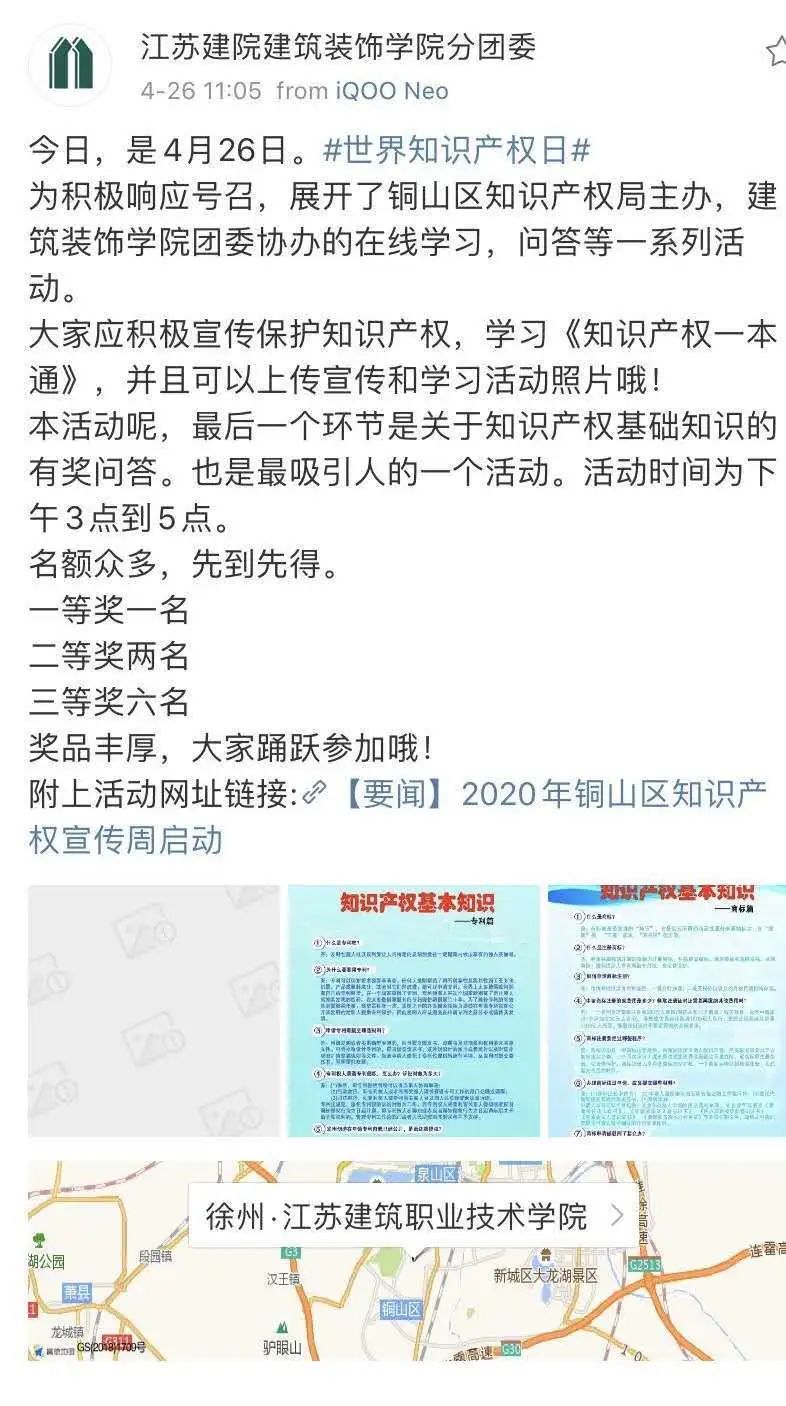 為深入貫徹落實習(xí)近平總書記關(guān)于知識產(chǎn)權(quán)工作的重要指示,助力抗擊疫情、服務(wù)復(fù)工復(fù)產(chǎn),提升全社會知識產(chǎn)權(quán)意識,4月26日,由銅山區(qū)知識產(chǎn)權(quán)局主辦、江蘇建院建筑裝飾學(xué)院團(tuán)委協(xié)辦,開展了以“知識產(chǎn)權(quán)與健康中國”為主題的知識產(chǎn)權(quán)進(jìn)校園活動,活動內(nèi)容主要是線上學(xué)習(xí)知識產(chǎn)權(quán)基本知識和有獎答題。建筑裝飾學(xué)院22個團(tuán)支部2045名學(xué)生積極參與了此項活動。