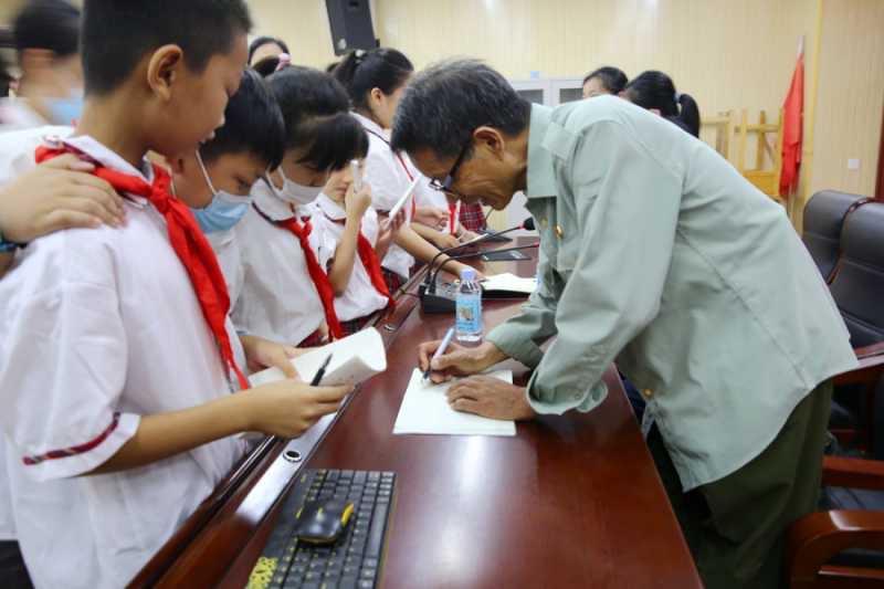 故事會上,小學(xué)生為軍休老兵朗誦了詩歌《致敬老兵》,呂傳增將自己創(chuàng)作的“桃李天下春暉四方”內(nèi)容書法作品贈送給學(xué)校。學(xué)校還向兩位軍休干部頒發(fā)了校外輔導(dǎo)員聘書,活動結(jié)束后,學(xué)生們紛紛圍上前來,請兩位老兵簽字留念。