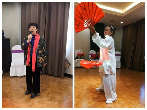 李桂云同學(xué)首先為大家深情演唱了歌曲《最親的人》;朱宗蘭同學(xué)演唱了《親愛的黨永遠跟著你》;周秀榮同學(xué)表演了《太極扇子舞》 ;趙世玲同學(xué)用口琴吹奏《我的祖國》;董長惠等三人為大家跳起了歡快的水兵舞《好兄弟好姐妹》,一下子把才藝展示推向了高潮,聚會現(xiàn)場歡聲笑語,掌聲不斷。正當(dāng)同學(xué)們意猶未盡時,《再不晃就老了》這一膾炙人口的音樂響起,大家一邊唱,一邊跟著音樂節(jié)奏搖晃著身體,同學(xué)們沉浸在幸福歡樂之中。