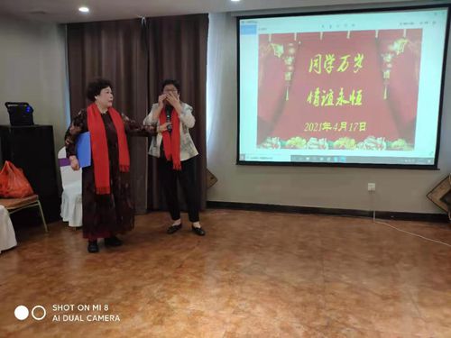 宴會大廳內(nèi)喜慶溫馨,PPT大屏幕上“同學(xué)萬歲 情誼永恒”八個大字突出這次同學(xué)聚會的鮮明主題。紅色橫幅“旗山礦校六七屆同學(xué)51年慶典聚會”映入眼簾。