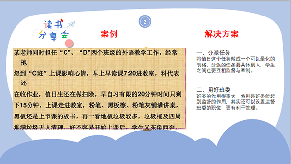 駱老師接著分享了自己在讀這本書時(shí)的一些心得體會(huì),她將自己的心得體會(huì)以案例+解決方案的方式進(jìn)行呈現(xiàn)。她主要分享了“怎樣排座位大家才能都滿意”和“怎樣衛(wèi)生值日最合理”。