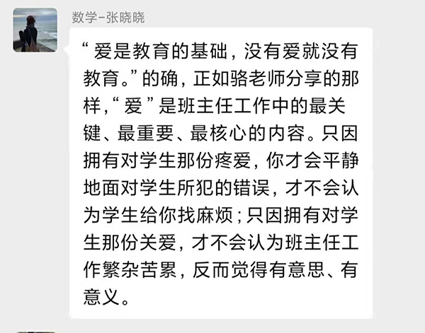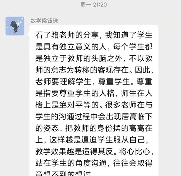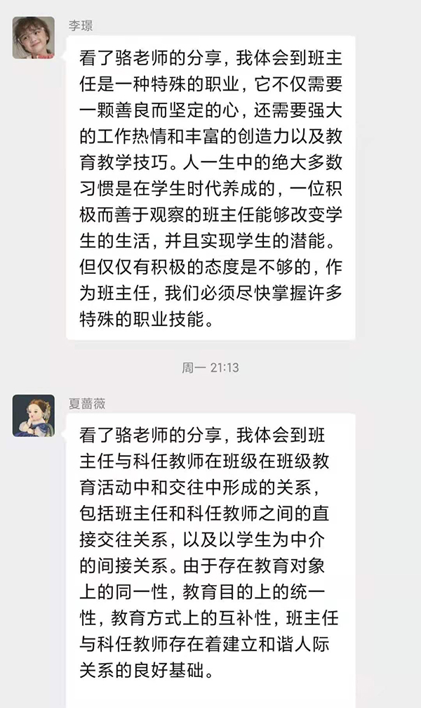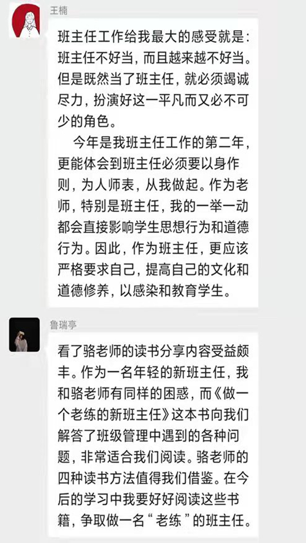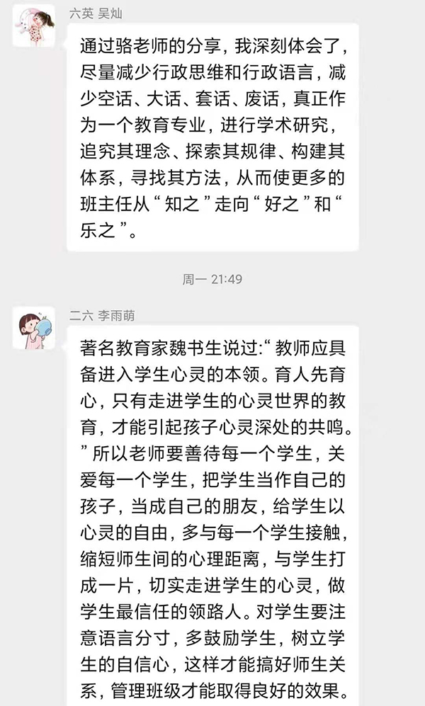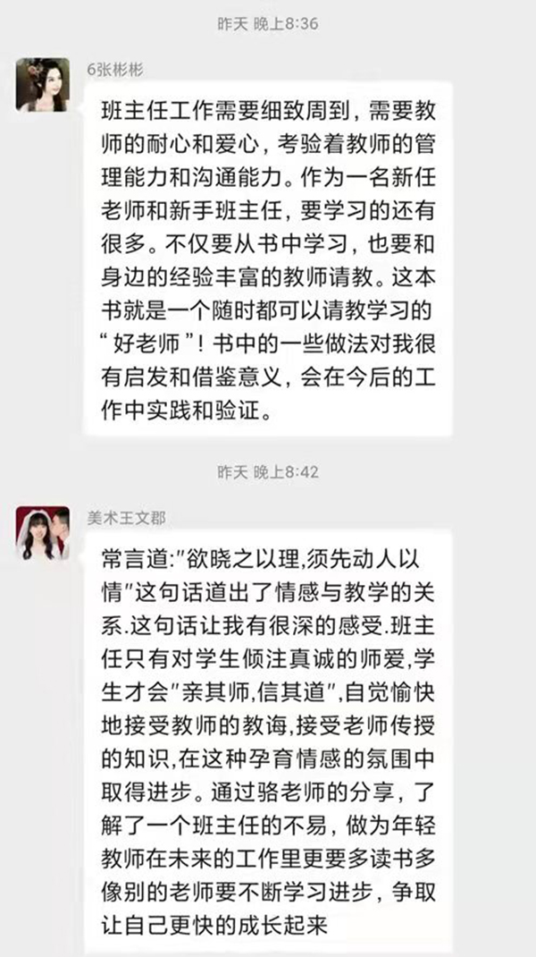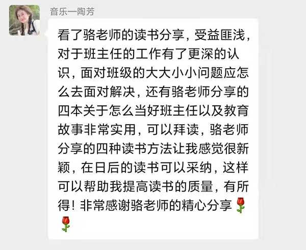 最后,全校的青年教師針對(duì)駱老師的讀書分享踴躍地分享了自己的見解與感受。大家普遍認(rèn)為:班級(jí)管理不是一時(shí)興起的,是從平時(shí)的點(diǎn)點(diǎn)滴滴做起的。而班主任工作是一項(xiàng)復(fù)雜的工作,你只有從點(diǎn)滴做起,從小事做起,因勢(shì)利導(dǎo),做到潤物細(xì)無聲,給學(xué)生更多的人文關(guān)懷,才能把工作做到學(xué)生的心里去。
