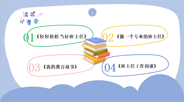 此外,駱老師還推薦了四本和班主任工作有關(guān)的書籍:《輕輕松松當(dāng)好班主任》、《做一個(gè)專業(yè)的班主任》、《我的教育故事》、《班主任工作漫談》。