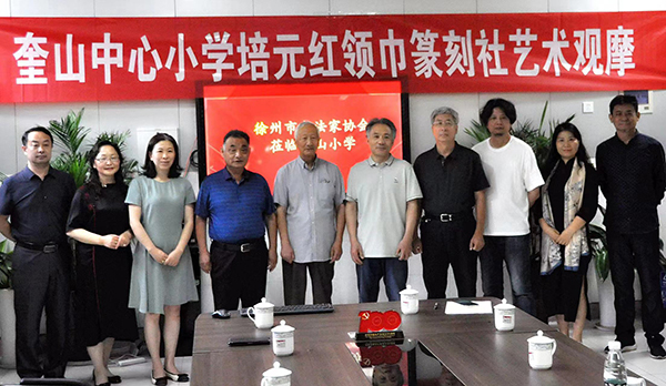 黃淮網(wǎng)(行遠(yuǎn)) 6月20日下午,徐州市奎山小學(xué)培元紅領(lǐng)巾篆刻社藝術(shù)觀摩在奎山小學(xué)舉行。觀摩會迎來了徐州市書法家協(xié)會的客人,他們是江蘇省書協(xié)副主席、徐州市書協(xié)主席馬亞先生、江蘇省書法家協(xié)會理事、西楚印社社長祝培良先生,以及徐州市書協(xié)的秘書長、副秘書長沈鵬先生、臧海洋先生,徐州市書協(xié)理事陳百舸,書協(xié)會員田密女士,李文華女士,以及徐州文史學(xué)者李世明先生等。