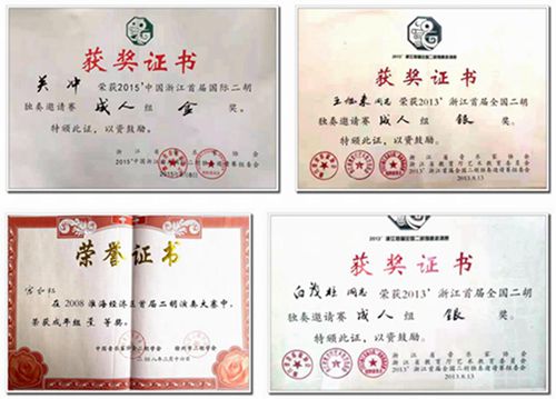 ▲ 34徐州非職業(yè)二胡高手的部分獲獎(jiǎng)證書。