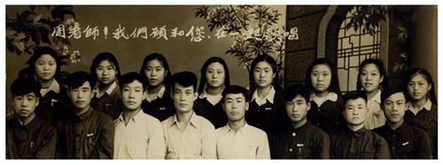 ▲ 18 周鴻聲老師(前左4)與鐵中愛好文藝的學(xué)生們?cè)谝黄?前左3為張家強(qiáng))。
