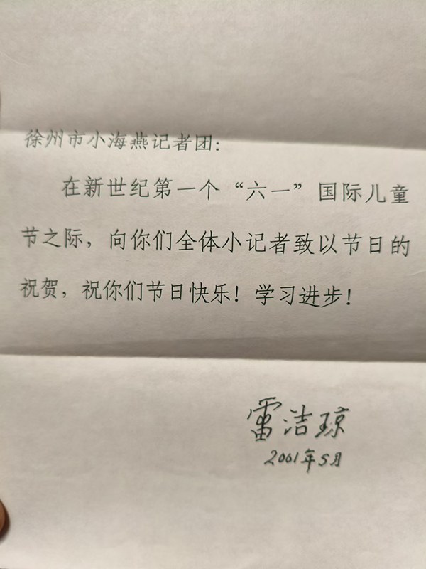 1996年5月,時(shí)任全國(guó)人大副委員長(zhǎng)、民進(jìn)中央主席的雷潔瓊十分關(guān)心小海燕記者團(tuán)的成長(zhǎng),對(duì)小海燕記者團(tuán)寄予殷切希望。為讓小海燕記者團(tuán)的小記者過(guò)一個(gè)愉快的“六一”,在“六一”國(guó)際兒童節(jié)之際,她為小海燕記者團(tuán)題寫(xiě)了“勇于實(shí)踐,培育英才”的題詞寄給記者團(tuán)。作為一位國(guó)家和一個(gè)民主黨派的領(lǐng)導(dǎo)人,在國(guó)事繁忙的情況下,能想到孩子,對(duì)孩子熱情鼓勵(lì),是何等難能可貴!這使每位小記者和老師都感動(dòng)不已。多少年來(lái),小海燕記者團(tuán)沒(méi)有辜負(fù)雷奶奶的殷切希望,培養(yǎng)出一批又一批精英人才。