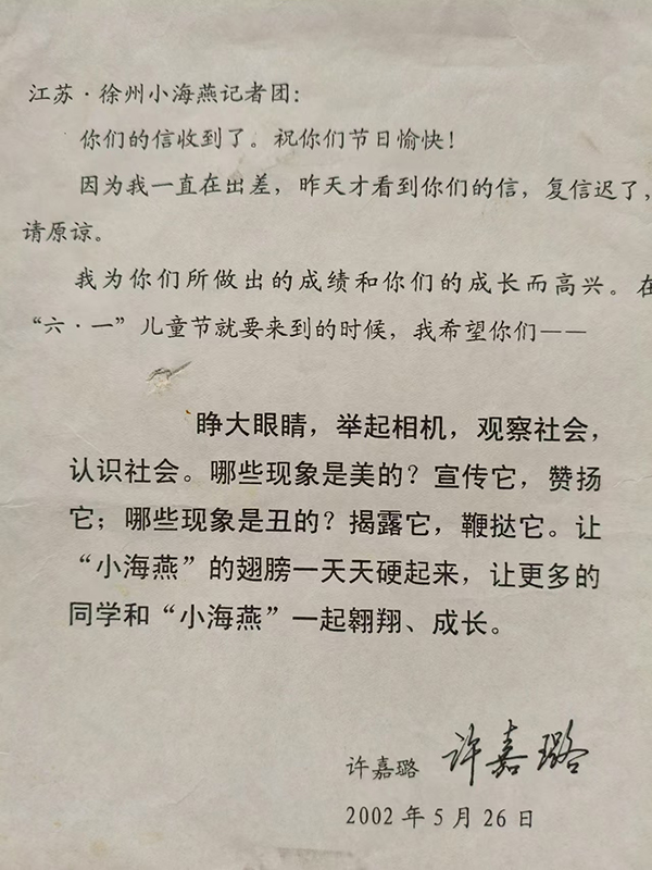 那年5月中旬,小海燕記者團(tuán)向全國(guó)人大常委會(huì)副委員長(zhǎng)、民進(jìn)中央主席許嘉璐發(fā)出一封信,信中向許主席匯報(bào)了記者團(tuán)在黨的培養(yǎng)下,在民進(jìn)中央的支持下開(kāi)展的活動(dòng)和取得的成就。許主席看到這封信后十分高興,當(dāng)即為記者團(tuán)發(fā)出賀信。他在信中說(shuō):“我為你們所做出的成績(jī)和你們的成長(zhǎng)而高興。‘六一’兒童節(jié)就要來(lái)到的時(shí)候,希望你們——睜大眼睛,舉起相機(jī),觀察社會(huì),認(rèn)識(shí)社會(huì)。哪些現(xiàn)象是美的?宣傳它,贊揚(yáng)它;哪些現(xiàn)象是丑的?揭露它,鞭撻它。讓小海燕的翅膀一天天硬起來(lái),讓更多的同學(xué)和‘小海燕’一起翱翔、成長(zhǎng)。”