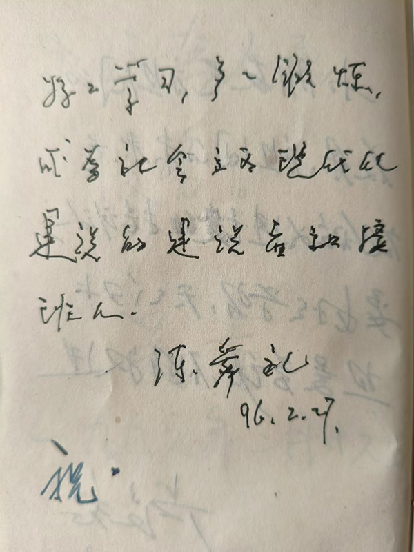 1996年2月27日上午,小海燕記者團(tuán)專車開(kāi)進(jìn)民進(jìn)中央的院內(nèi)。當(dāng)時(shí)民進(jìn)中央原址由于辦公條件不太好,會(huì)議室里凳子不夠坐,40多名小記者坐在地毯上,依偎在陳舜禮爺爺?shù)纳磉,陳副主席看著孩子們活潑可?ài)的笑臉,就像祖國(guó)大花園中美麗的花朵,他和藹可親,談笑風(fēng)生,循循善誘,從民進(jìn)中央的發(fā)展史,講到今天的參政議政和改革開(kāi)放。他向小記者講述了要怎樣學(xué)習(xí),怎樣求職,怎樣做人。接見(jiàn)后,陳副主席揮筆為記者團(tuán)題寫(xiě)了“好好學(xué)習(xí),多多鍛煉,成為新世紀(jì)社會(huì)主義現(xiàn)代化的建設(shè)者和接班人。”