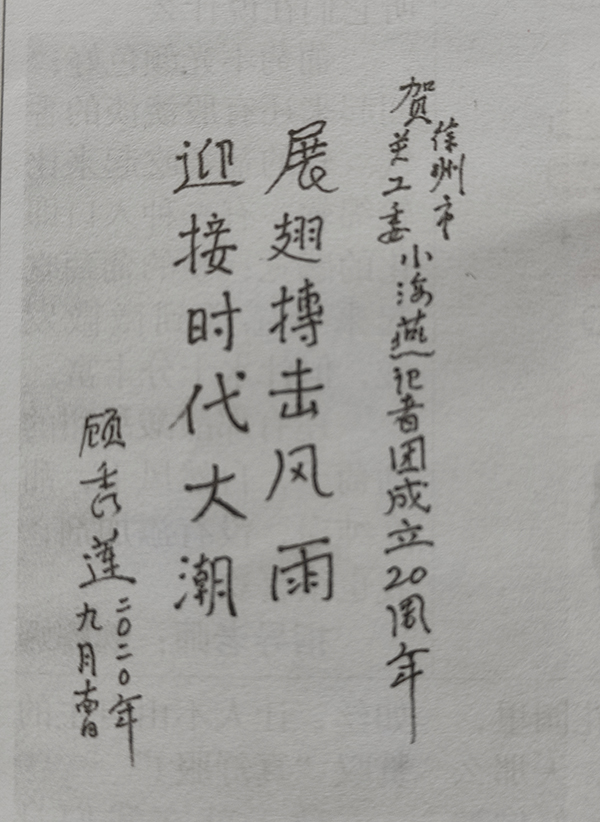 在小海燕記者團成立20周年之際,顧秀蓮主任到徐州視察,得知小海燕記者團成立20周年了,十分高興,不顧疲勞,為小海燕記者團揮筆寫下了“展翅搏擊風雨,迎接時代大潮”的題詞,讓小記者們深受感動和鼓舞,這是對“小海燕”們的鼓勵,也是鞭策。小海燕記者團決定把顧奶奶的題詞作為小海燕記者團的口號牢牢記在心里。