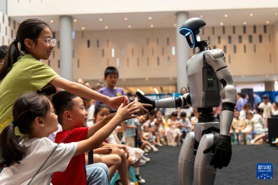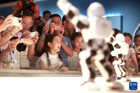 7月27日,在浙江省金華市金華之光文化廣場科技館,青少年與人形機(jī)器人互動(dòng)。