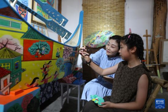 7月27日,在江蘇省興化市昭陽街道的垛上農(nóng)民畫非遺工坊,孩子在老師的指導(dǎo)下進(jìn)行農(nóng)民畫作品創(chuàng)作。