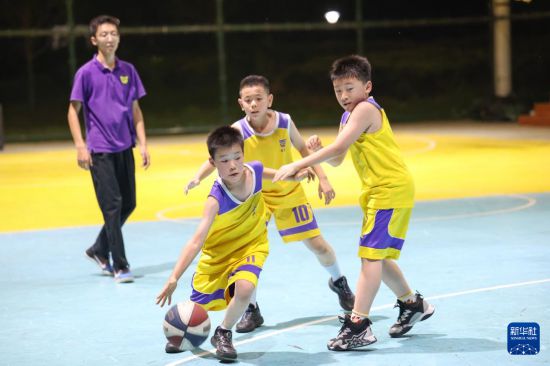 7月26日,孩子們在湖北省襄陽市襄城區(qū)檀溪路一家運(yùn)動(dòng)公園打籃球。