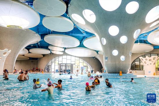 7月27日,在山東省榮成市少年宮游泳館內(nèi),參加暑期游泳技能培訓(xùn)班的孩子們在訓(xùn)練間歇嬉戲。