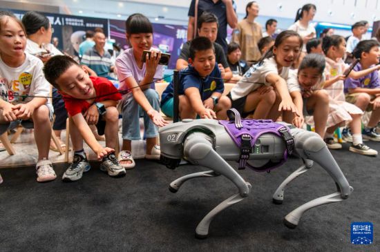 7月27日,在浙江省金華市金華之光文化廣場科技館,青少年與機(jī)器人互動(dòng)。
