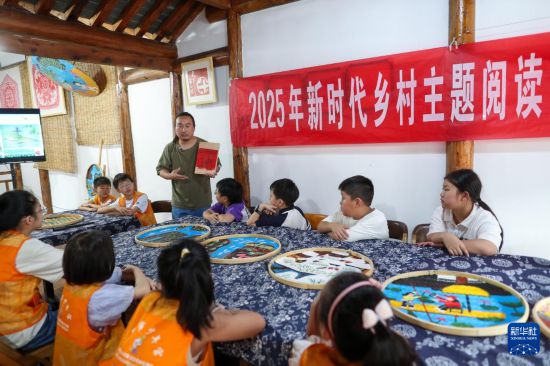 7月27日,在江蘇省興化市昭陽街道的垛上農(nóng)民畫非遺工坊,老師在“2025新時(shí)代鄉(xiāng)村主題閱讀”活動(dòng)中給孩子們講解版畫知識。
