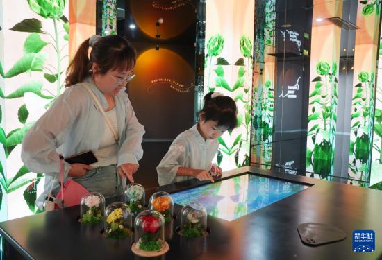 7月27日,在云南省昆明市呈貢區(qū)中國斗南花卉展覽館,小朋友在觸摸屏上了解鮮花生長過程。