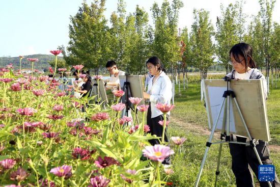 7月27日,在河南省洛陽市汝陽縣北汝河畔,學(xué)生在盛開的花叢旁寫生。