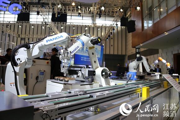 圖為南京熊貓電子在世界智能制造大會(huì)上展出生產(chǎn)中常用的機(jī)械臂。工作人員介紹,機(jī)械臂的推廣使用,讓很多車間實(shí)現(xiàn)了無人化生產(chǎn)。是鐘寅攝