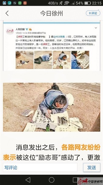 他全身伏地,凌亂的頭發(fā)里、單薄的工作服上落滿了灰。身邊是一本趙體字帖,手里是一支狼毫,隨身攜帶的塑料瓶里裝的不是水,而是寫字用的墨汁。肘下壓著的宣紙上寫了半張毛筆字。這是吳明1月6日上人民日報官方微博時的“形象”。短短幾天,這則微博的點贊量破16萬,評論過萬,并被羊城晚報、京華時報、華商報、南京日報等官方微博及眾多網(wǎng)絡(luò)大V轉(zhuǎn)載。