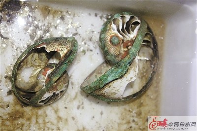 邳州發(fā)現(xiàn)的這只鸚鵡螺杯,口沿和背部被裝上青銅扣箍,螺殼上被精細地畫上類似鴛鴦或鸚鵡的圖案。南京博物院考古研究所所長林留根說,1965年從南京出土的那只鸚鵡螺杯沒有彩繪,煎藥廟出土的這只是全國第二次發(fā)現(xiàn)這種文物,有彩繪,并且時代是更早的西晉,殊為難得。