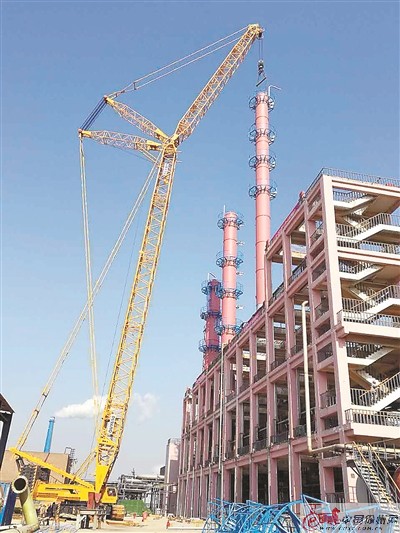 工人正在安裝精餾塔。 通訊員 劉晨 攝