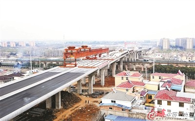 最后一根箱梁架設(shè)完畢,實現(xiàn)全線貫通。     徐州日報記者 陳艷 攝
