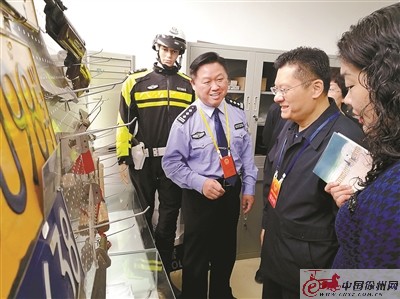 隨后,代表們又來到徐州公安交警藍劍突擊隊視察。據(jù)該大隊長熊壯介紹,作為反恐維穩(wěn)處突的一支重要新生力量,自2015年2月組建以來,藍劍突擊隊始終把維護交通、應急處突、打擊犯罪、服務民生作為莊嚴使命和承諾。突擊隊武裝巡邏里程達30萬公里,查處各類交通違法近5萬起,查獲網(wǎng)逃、吸毒等犯罪嫌疑人近百起,出色完成了“清明”、全國“兩會”、紀念抗戰(zhàn)70周年、杭州G20峰會、大型演唱會安保及高考、中考護航等任務,在省廳組織的應急處突演練和比武考核中,因最先到達、反應迅速受到省廳領導的高度贊揚。