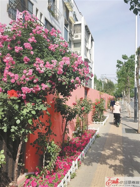 “北側(cè)墻內(nèi)是上院小區(qū)一樓住戶,他們本來在后院就有綠植,所以此次打造我們特意設(shè)置了‘翻墻’的薔薇,這樣能把墻內(nèi)墻外的綠植連為一體,而且非常自然,乍一看,好像綠植是從墻內(nèi)爬出來的。”