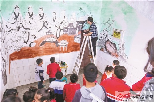 日前,豐縣廣宇中英文學(xué)校師生在觀看該校美術(shù)老師張寧創(chuàng)作的壁畫《孔子講學(xué)》。據(jù)了解,該校將在教學(xué)樓、文化長廊、操場等處手繪傳統(tǒng)文化故事類壁畫,以生動質(zhì)樸的藝術(shù)形式,對學(xué)生進(jìn)行傳統(tǒng)道德、文化、治學(xué)的熏陶。 徐州日報記者 陳艷 通訊員 高榮光 攝 |