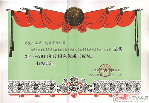 2013-2014年度混凝土建設(shè)機(jī)械產(chǎn)業(yè)化基地國家優(yōu)質(zhì)工程獎。