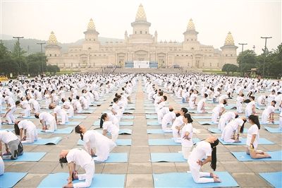 25日,無(wú)錫靈山腳下,來(lái)自國(guó)內(nèi)外的近萬(wàn)名瑜伽愛(ài)好者,在10位印度瑜伽大師的帶領(lǐng)下集體練習(xí)瑜伽。無(wú)錫已連續(xù)3年舉辦國(guó)際瑜伽節(jié),參與人數(shù)呈幾何級(jí)增長(zhǎng)。 (馬薇 盧易)