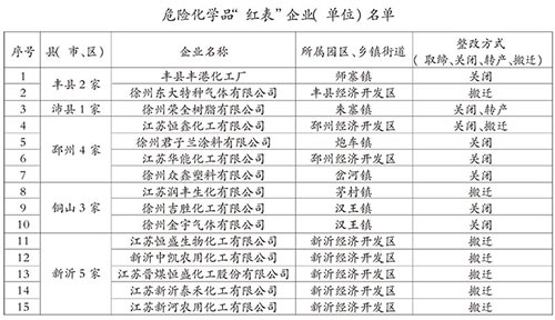 2016年5月20日,省政府辦公室下發(fā)《省政府辦公廳關(guān)于印發(fā)江蘇省危險化學(xué)品安全專項整治實施方案的通知》,要求對未經(jīng)許可、未依法取得相關(guān)資質(zhì)、安全距離不符合要求及不具備安全生產(chǎn)條件等5類企業(yè),列入“紅表”企業(yè)名單。6月22日,市政府辦公室下發(fā)《關(guān)于印發(fā)徐州市危險化學(xué)品安全專項整治實施方案的通知》,通過各縣(市)區(qū)全面摸底排查,共摸排15家“紅表”企業(yè),并制訂了切實可行的取締、關(guān)閉、轉(zhuǎn)產(chǎn)、搬遷方案,全力推進(jìn)工作落實。