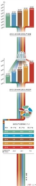 2012年—2016年,江蘇生產(chǎn)總值年均增長8.6%,高于全國平均增速1.4個百分點。人均GDP去年達到95257元,居各省區(qū)之首。