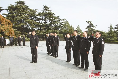 在王文生領(lǐng)誓下,市局黨委成員面對(duì)黨旗,舉起右手莊嚴(yán)宣誓。錚錚誓言久久回蕩,表達(dá)了市局黨委“不忘初心、牢記使命”的堅(jiān)定政治信念。宣誓活動(dòng)結(jié)束后,全體人員緩步繞塔一周,瞻仰淮海戰(zhàn)役烈士紀(jì)念塔。隨后,市公安局黨委成員還觀看了徐州市見(jiàn)義勇為英烈紀(jì)念廣場(chǎng)。