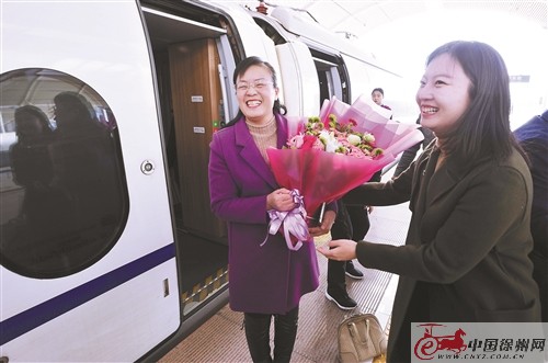 11月18日上午,從北京駛來的列車緩緩進(jìn)入高鐵徐州東站,工作人員用鮮花迎接受到中央表彰的第六屆全國道德模范周長芝。