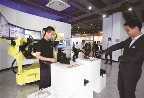 拓普互動工作人員在鼓樓云創(chuàng)科技園演示仿生手掌和多屏融合實感賽車。通訊員 蒯創(chuàng) 攝