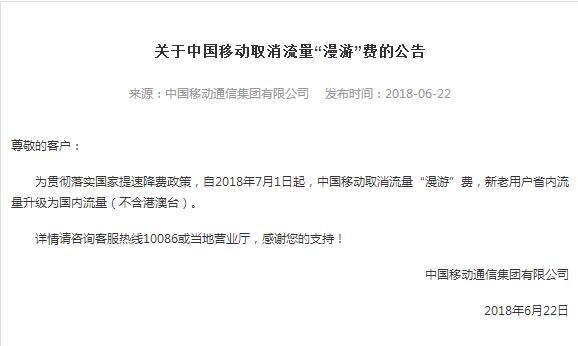 人民網(wǎng)北京6月22日電 (朱江)記者從中國移動通信集團有限公司(以下簡稱“中國移動”)獲悉,今日上午,中國移動發(fā)布關(guān)于取消流量“漫游”費的公告,公告顯示,自2018年7月1日起,中國移動取消流量“漫游”費,新老用戶省內(nèi)流量升級為國內(nèi)流量(不含港澳臺)。